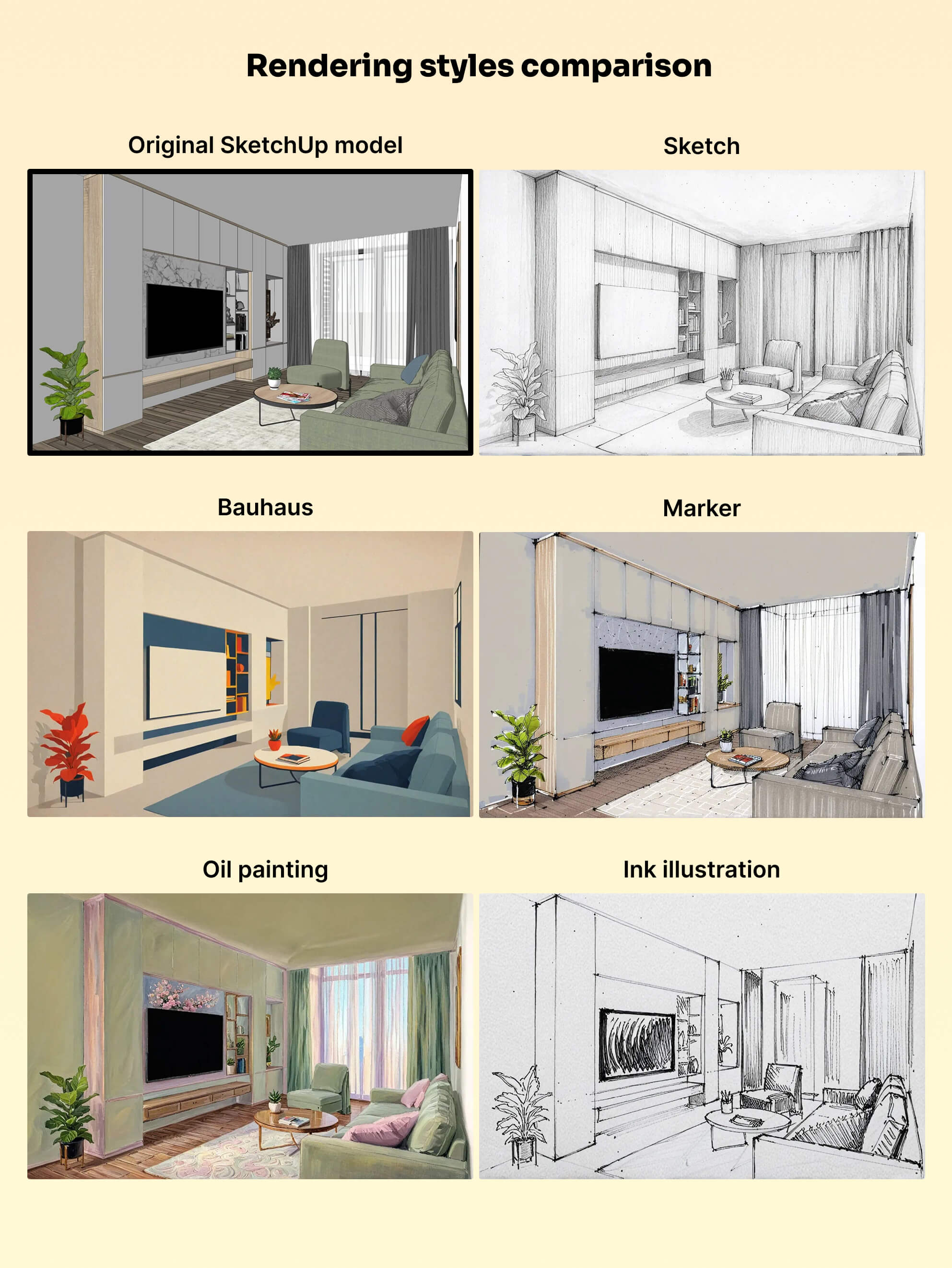 To make differences obvious, we ran the same SketchUp scene through some of the most common rendering styles using MyArchitectAI, an AI-powered rendering tool that makes the process super easy.