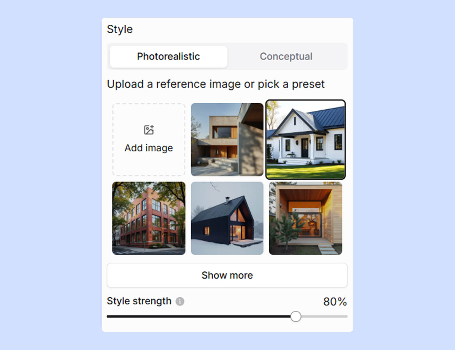 The rendering process using AI-based architectural software is much more straightforward than when using traditional solutions. All you need to do is upload your sketch or CAD model to the app, select your desired settings from a simple user interface (usually sliders and dropdown options), and hit the generate button.
