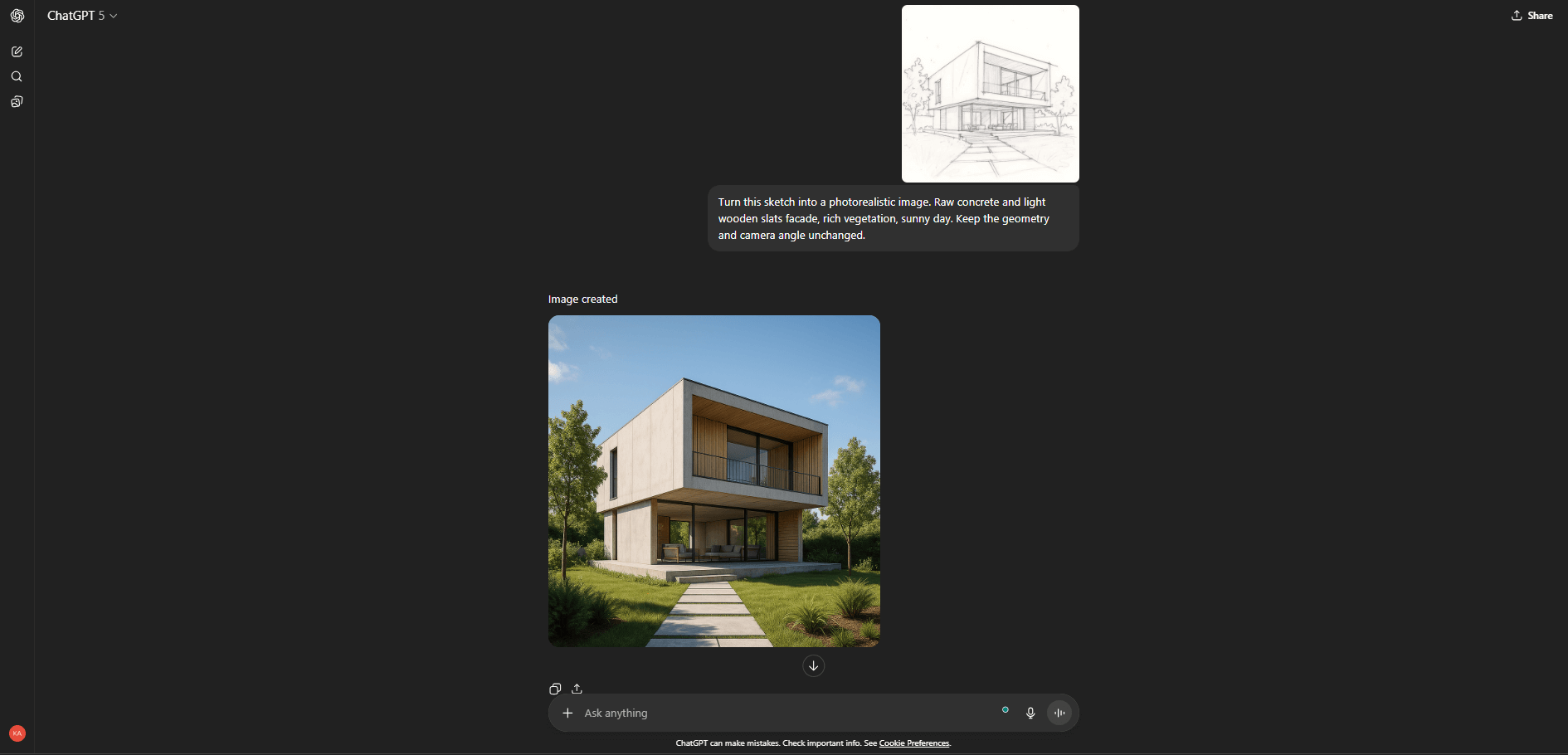 ChatGPT can produce fairly realistic images, but it’s less accurate than specialized sketch-to-render tools. It often changes framing and composition, even when you explicitly ask it not to.