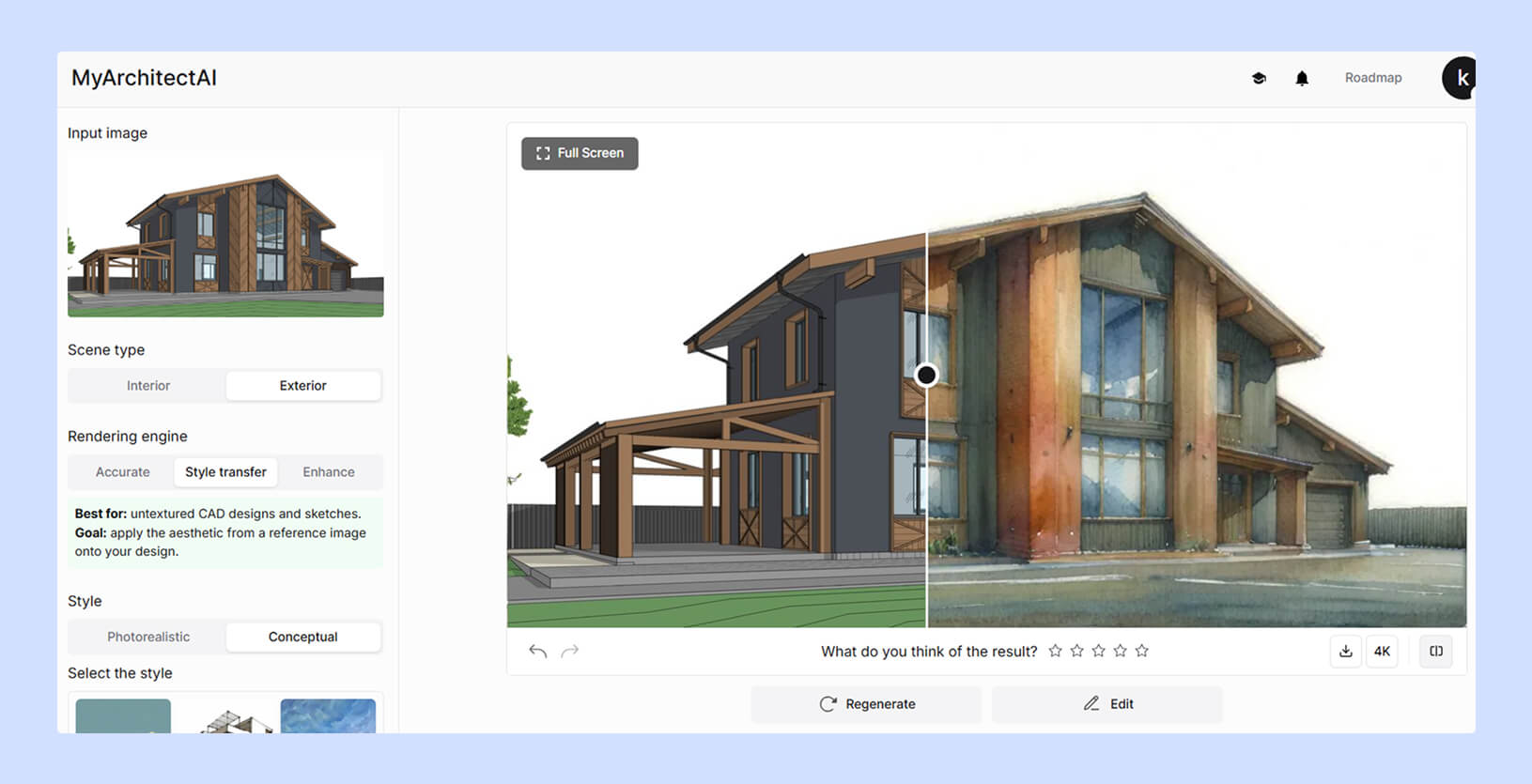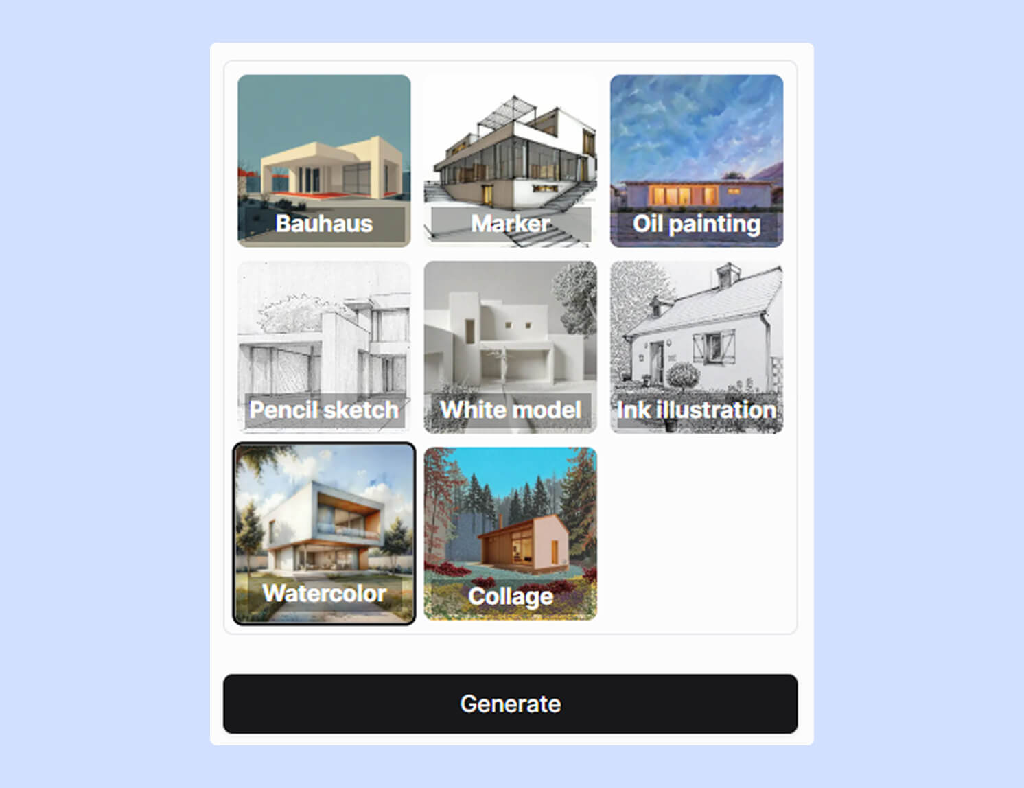 While you can convert a design to watercolor style using traditional image editing programs, using AI rendering software like MyArchitectAI is by far the easiest and quickest method. It lets you go from a drawing (or a CAD model) to watercolor rendering in under a minute.